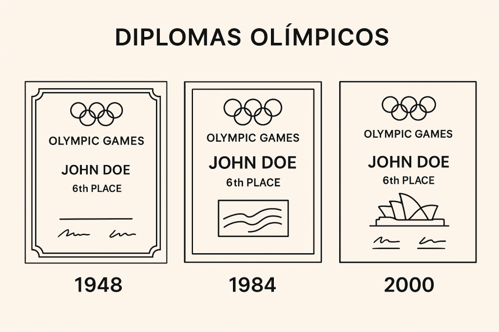 A modo de curiosidad, ya que seguiremos hablando de diplomas olímpicos, los primeros diplomas oficiales de 1948 medían 57,5×43,8 aproximadamente, con un estilo clásico y casi ceremonial, sobrios, reflejando con su estética la formalidad de la posguerra. Los de 1984, tras la ampliación al Top8, eran más modernos, coloridos y estilizados (31×35), muestran el dinamismo de los ochenta. Y los de Sídney, que marcaron otra pauta, ya pasaron a un 21×30, contemporáneos y elegantes. Un diseño más limpio, con elementos gráficos representativos. Minimalistas y más manejables. Una cosa así.